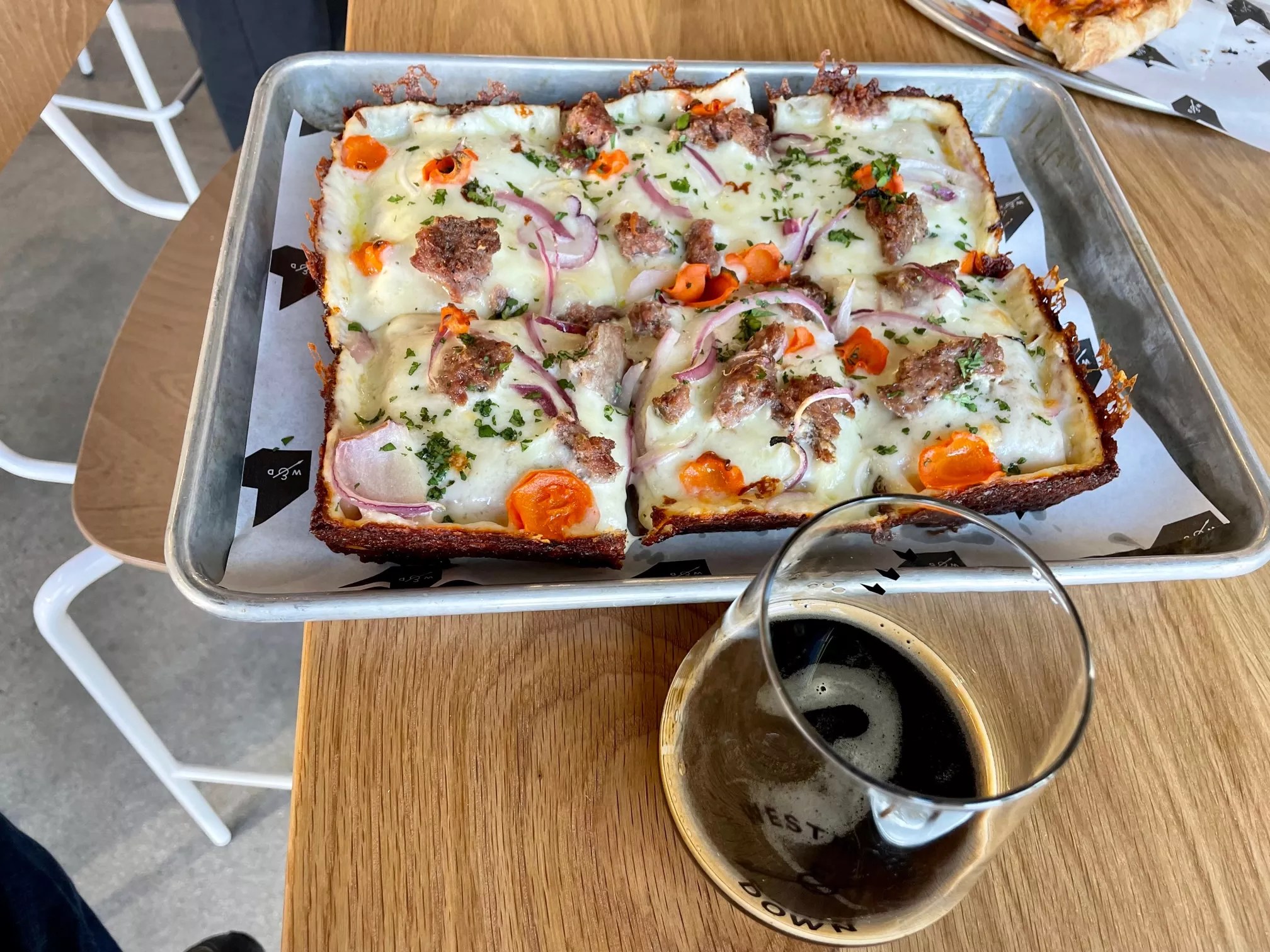 A Detroit-style pizza made with beer in the crust and in the sausage.