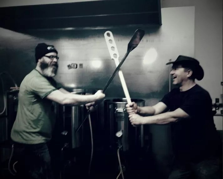 Scott Witsoe (left) and Tim Myers reenact a Star Wars scene with brewing equipment.
