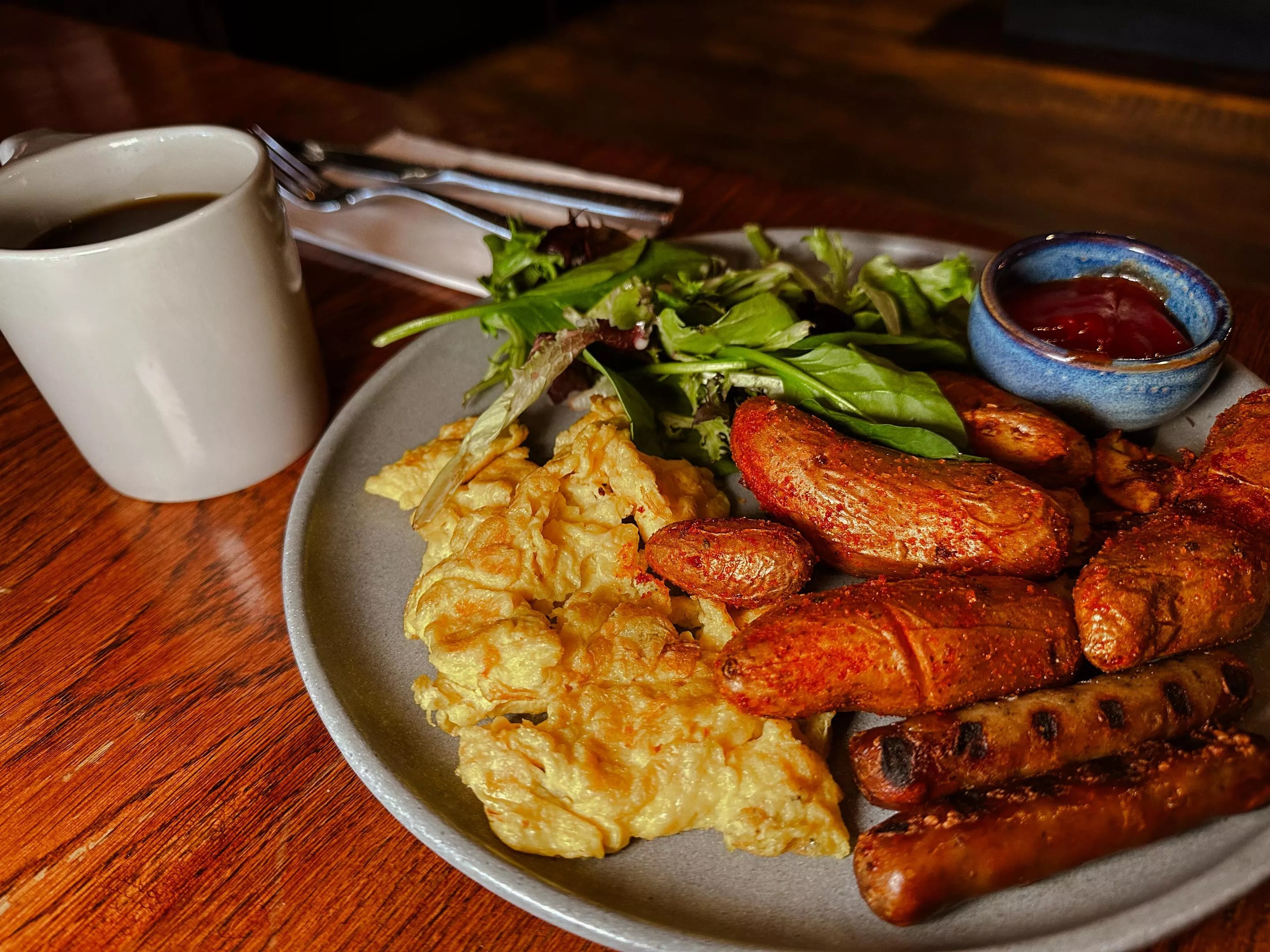 The Haus breakfast, complete with eggs, haus potatoes and sausage.