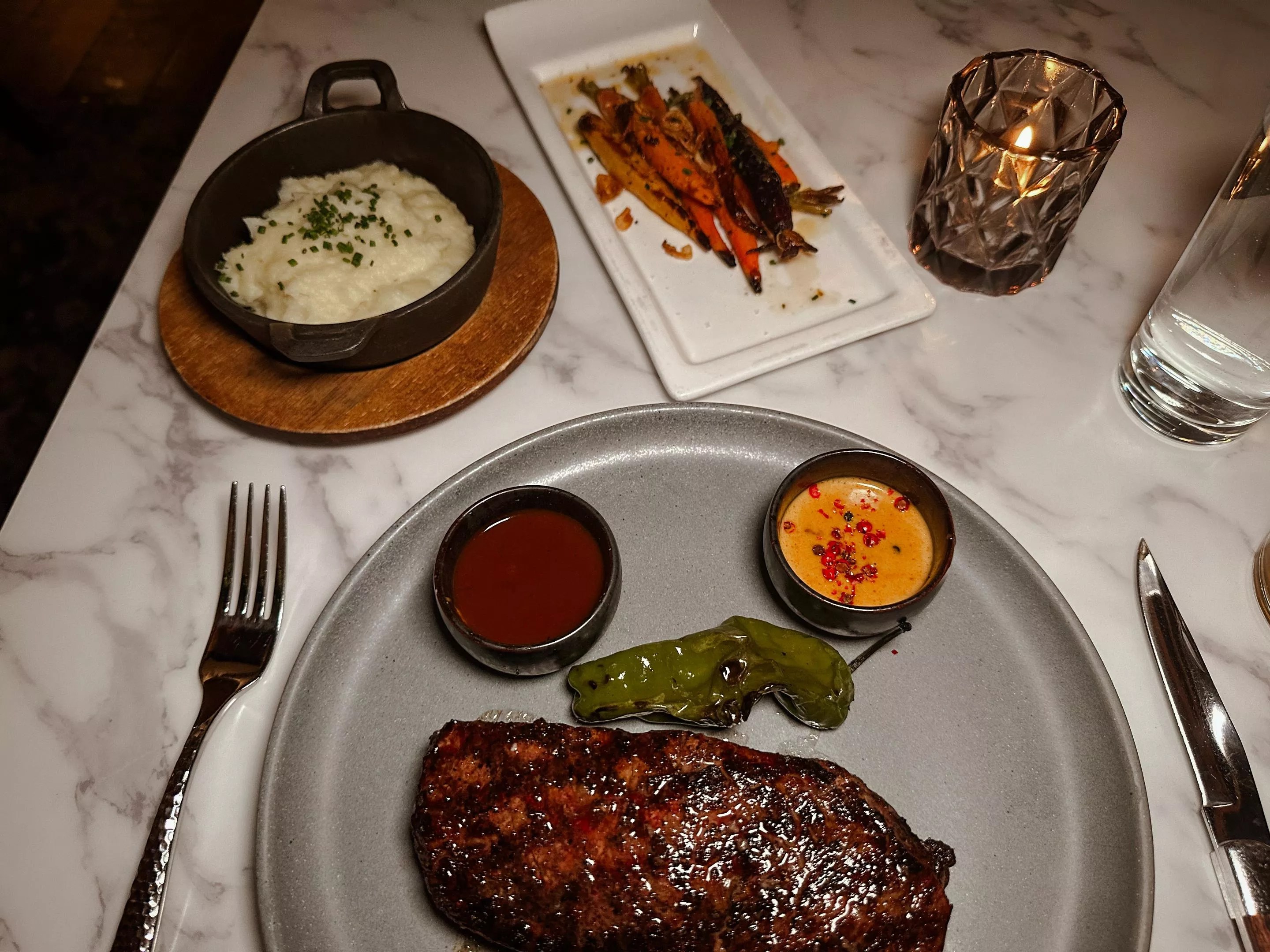At my server’s recommendation, I ordered the prime New York strip with two haus sauces: SR steak sauce and whiskey au poivre. My sides included roasted heirloom carrots and a Yukon gold purée with crème fraîche.